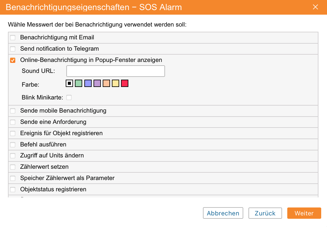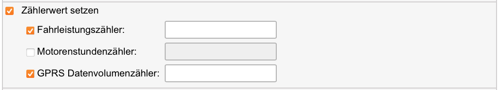 Diese Aktion wird verwendet, um Zählerwerte zu ändern (oder zurückzusetzen), wenn eine Benachrichtigung ausgelöst wird. Wählen Sie einen oder mehrere Zähler (Kilometerzähler, Motorstundenzähler, Datenzähler) und legen Sie neue Werte für sie fest.