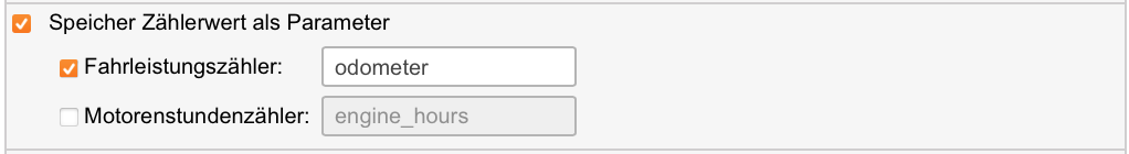 Diese Aktion wird verwendet, um die aktuellen Werte von Kilometer- oder Motorstundenzählern als Parameter in Einheitsdatenmeldungen (odometer oder engine_hours entsprechend) zu speichern. Diese Parameter können verwendet werden, um Sensoren auf ihrer Grundlage zu erstellen (z.B. Motorstundensensor) und um die Anfangs-/oder Endlaufleistung in Berichten zu erhalten. Für genauere Berechnungen wird empfohlen, Zähler zu lagern, während das Gerät geparkt ist, z.B. einmal täglich in der Nacht.