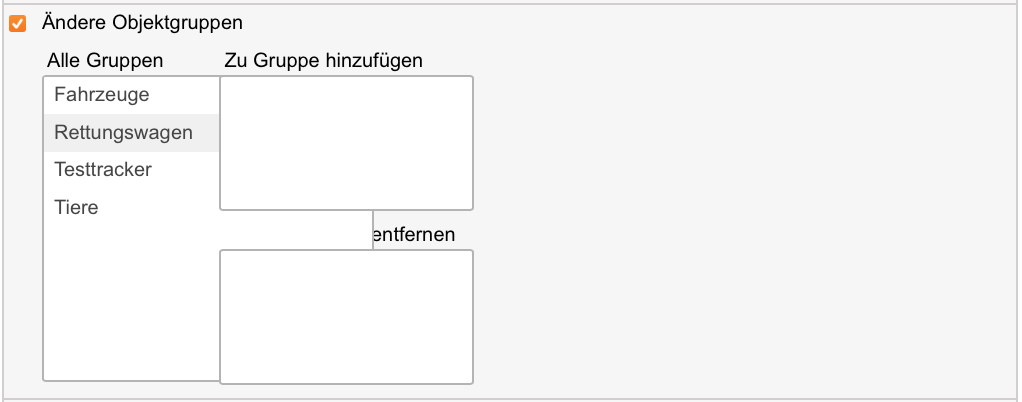 Diese Aktion wird verwendet, um den Inhalt von Objektgruppen zu ändern, wenn eine Benachrichtigung ausgelöst wird (Objekte können der Gruppe hinzugefügt oder daraus entfernt werden). Auf der linken Seite befindet sich eine Liste aller verfügbaren Einheitengruppen. Verschieben Sie die erforderlichen Gruppen in die Abschnitte Zur Gruppe hinzufügen oder Aus Gruppe entfernen. Infolgedessen wird das Gerät nach dem Auslösen der Benachrichtigung der Gruppe hinzugefügt oder aus der Gruppe entfernt.