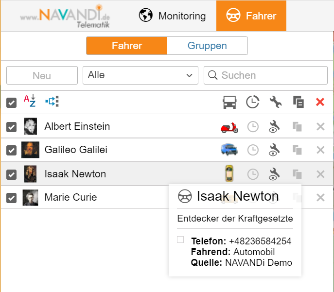 Das NAVANDi Telematik System bietet die Möglichkeit, die Liste der für Sie arbeitenden Fahrer zu erstellen und zu verwalten. Ein Mausklick kann einem Objekt einen Fahrer zuweisen, d.h. mit einem Fahrzeug verknüpfen. In Berichten wird der Fahrer für dieses Gerät angezeigt. Es ist besonders nützlich, wenn mehrere Fahrer dasselbe Objekt (Fahrzeug) benutzen. Es besteht auch die Möglichkeit, Fahrer mit Hilfe des iButton-Systems automatisch zu erkennen. Darüber hinaus können erstellte Fahrer zu Gruppen hinzugefügt werden.