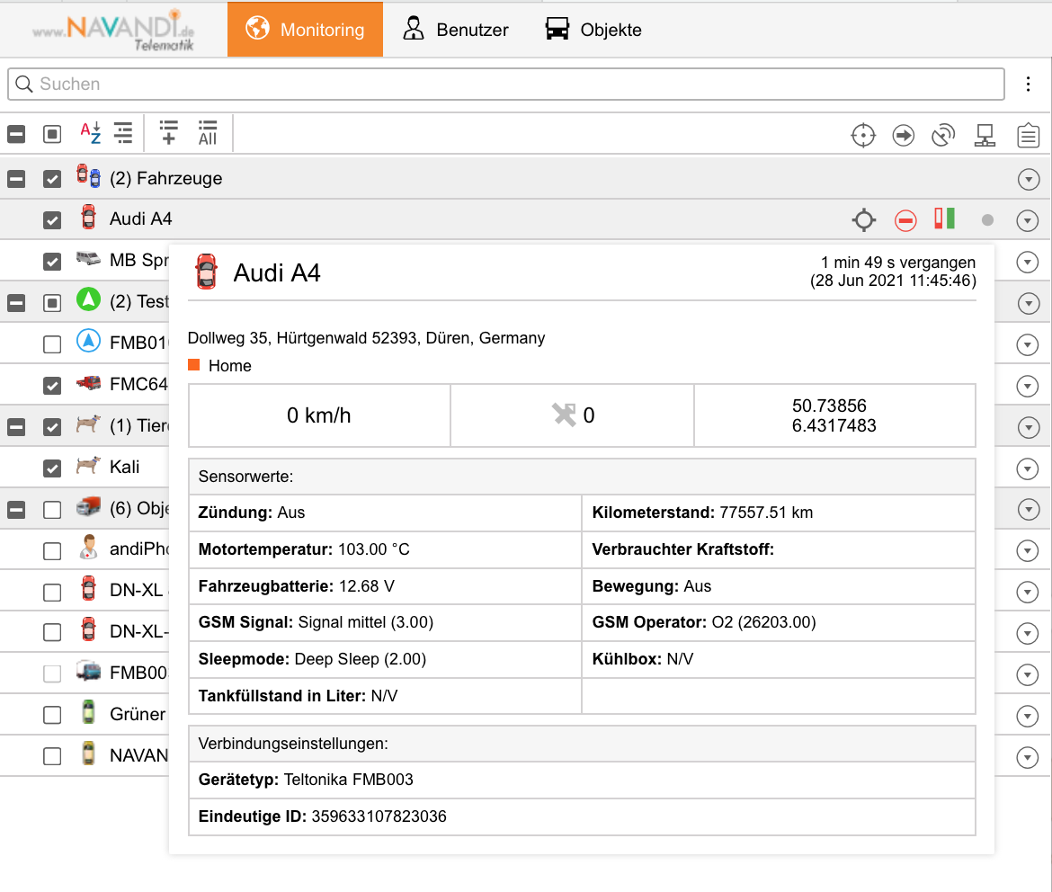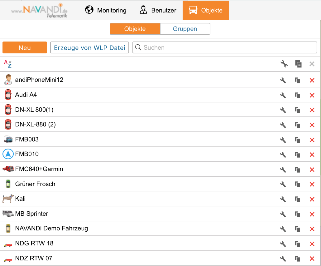 Ein Objekt ist ein Fahrzeug, eine Ausrüstungsgegenstand, eine Person, ein Haustier oder ein anderes bewegliches oder stationäres Objekt, das mithilfe von NAVANDi Telematik überwacht werden kann.