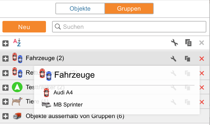 Die Liste der erstellten Objektgruppen wird im Arbeitsbereich angezeigt. Gruppen werden in alphabetischer Reihenfolge aufgelistet. Rechts neben jedem Gruppennamen sehen Sie, wie viele Objekte darin enthalten sind. Die Namen der in der Gruppe enthaltenen Objekte sind in der QuickInfo der Gruppe aufgeführt. Um die gewünschte Objektgruppe schnell zu finden, verwenden Sie die dynamische Suche oberhalb der Liste.