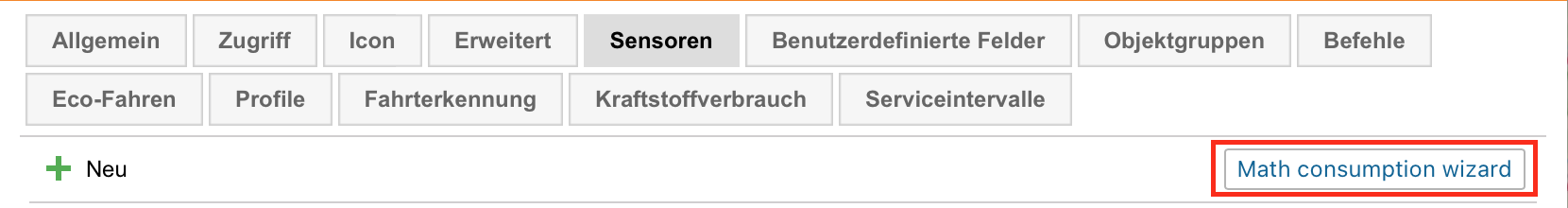Der Assistent vereinfacht die Erstellung und Konfiguration von Sensoren mit mathematische Berechnung des Kraftstoffverbrauchs. Die Berechnung des Kraftstoffverbrauchs erfolgt entsprechend der Geschwindigkeit der Objektes.