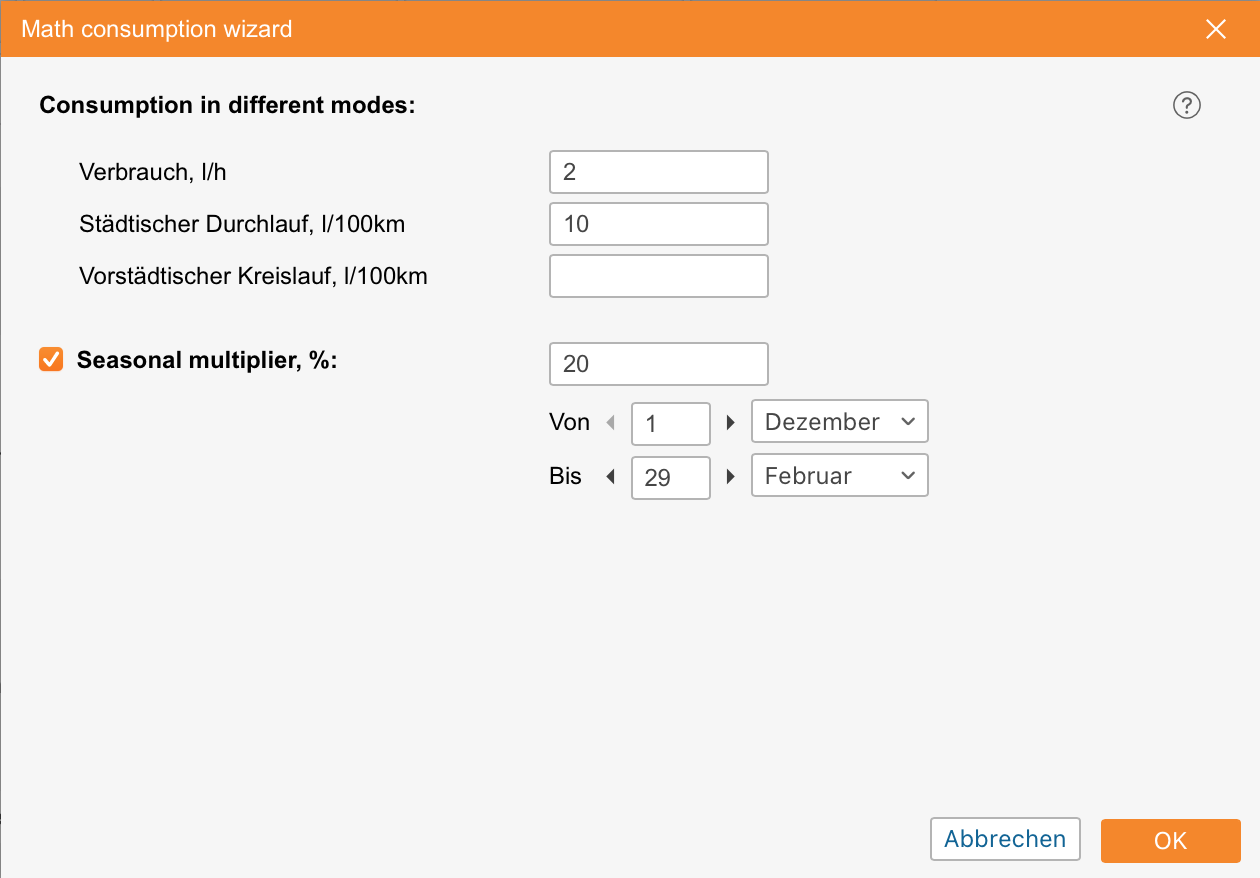 Im zweiten Abschnitt können Sie den Verbrauch der verschiedenen Modi und den saisonalen Multiplikator angeben.