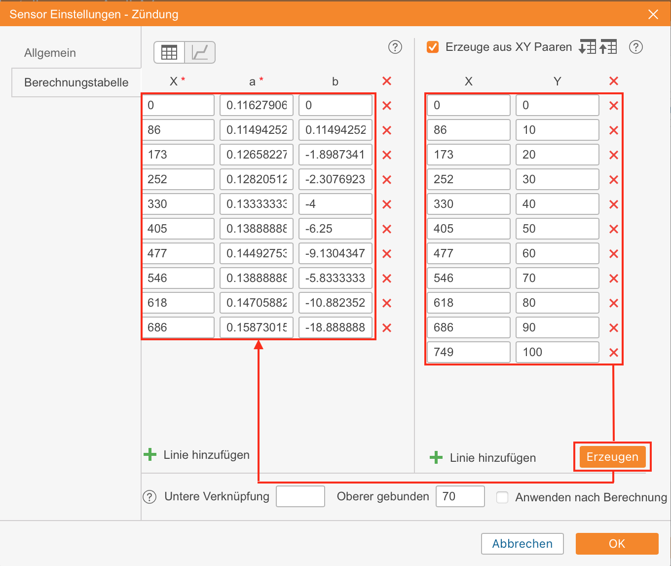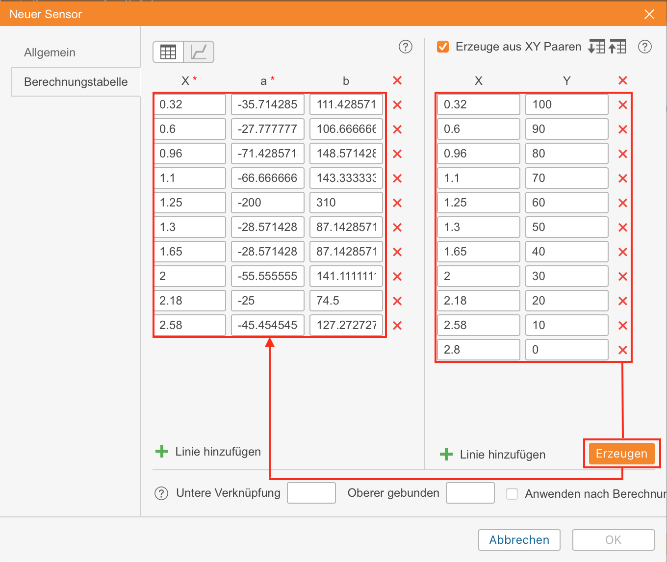 Geben Sie diese Paare in den Assistenten ein und klicken Sie auf Erzeugeb. Basierend auf den eingegebenen Werten wird eine Berechnungstabelle (links) generiert.