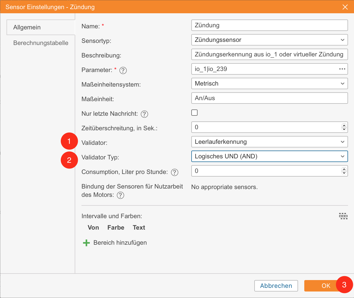 Die Validierung bestimmt die Abhängigkeit des Hauptsensors von einem Validator und ermöglicht es, Werte zu kombinieren, um einen Endwert zu erhalten. Sie können die Validierung konfigurieren, indem Sie einen Validator und einen Validierungstyp in den Sensoreigenschaften auswählen.