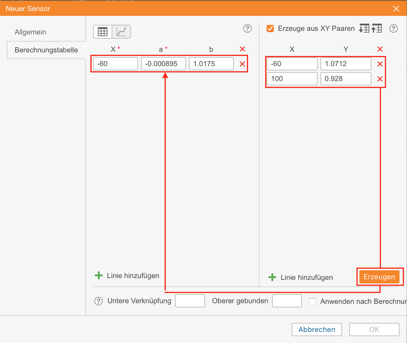 Geben Sie nun die für die minimalen und maximalen Temperaturwerte gefundenen Daten in die Felder des Berechnungstabellenassistenten ein und generieren Sie eine Berechnungstabelle.