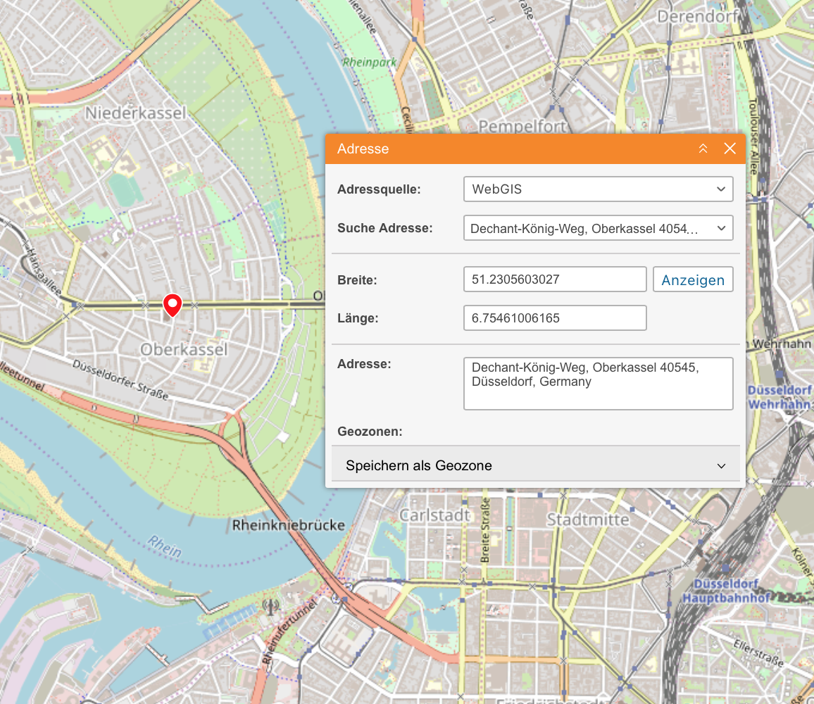 Doppelklicken Sie auf einen Pubkt auf der Karte, dessen Adresse Sie angezeigt haben möchten. Danach erscheinen der Breiten-, Längengrad und die Adresse des Punkts. Der Punkt selbst wird auf der Karte durch eine rote Markierung angezeigt. Wenn sich der ausgewählte Standort innerhalb einer Geozone befindet, wird er in im Feld Geozonen angezeigt.