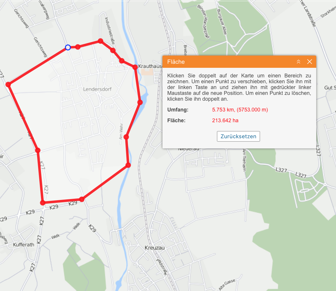 Dieses Werkzeug misst den Umfang und die Fläche des ausgewählten Abschnitts. Um eine Fläche zu erstellen, zeichnen Sie ein Polygon (Doppelklick fügt einen neuen Punkt hinzu). Der Umfang und die Gesamtfläche werden im Infofenster angezeigt..