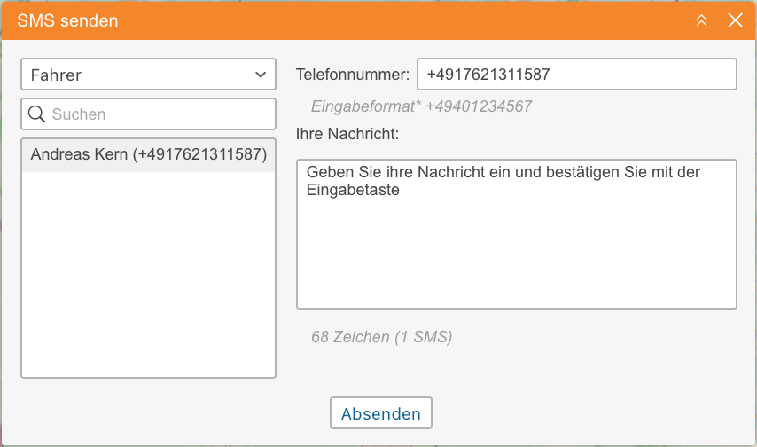 SMS-Nachrichten können an Fahrer, Objekte und an jede andere Telefonnummer gesendet werden. Der Dialog SMS ist auf den Registerkarten Monitoring, Objekte und Fahrer sowie im Dropdown-Menü Werkzeuge zugänglich. Die Schaltflächen werden nicht angezeigt, wenn der aktuelle Benutzer nicht über die Rechte zum Senden von SMS-Nachrichten verfügt.