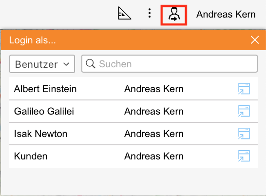 Es gibt eine alternative Möglichkeit, sich als anderer Benutzer anzumelden. Öffnen Sie dazu die Registerkarte Benutzer und klicken Sie auf das Symbol