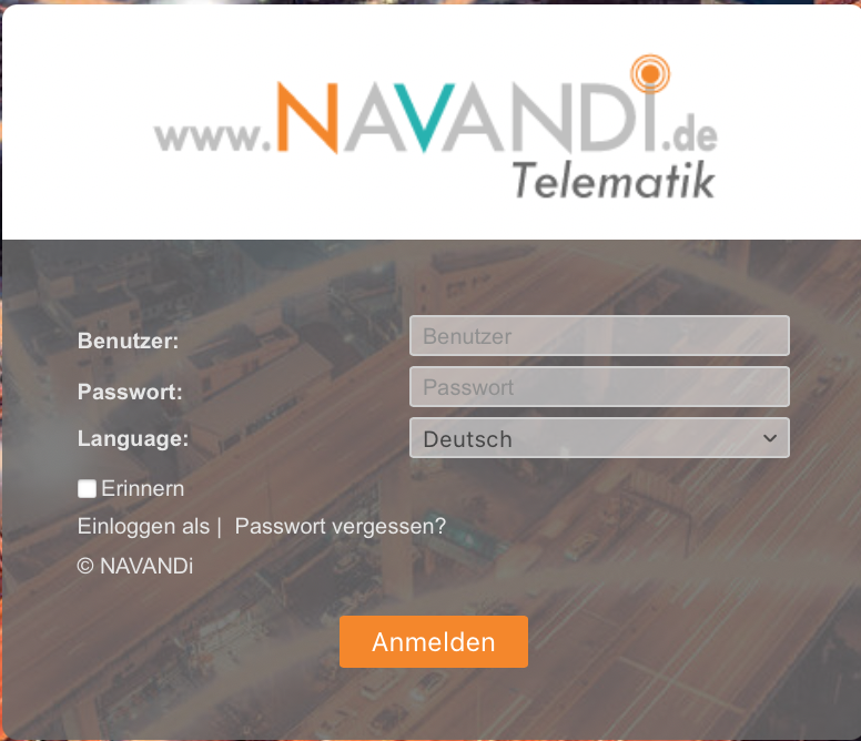 Um sich bei NAVANDi Telematik anzumelden, geben Sie den Benutzernamen und das Passwort auf der Login- Seite an. Es wird zwischen Groß- und Kleinschreibung unterschieden. Wählen Sie als Nächstes die Sprache der Benutzeroberfläche aus. Bei Bedarf können Sie die Sprache später in den Benutzereinstellungen ändern.