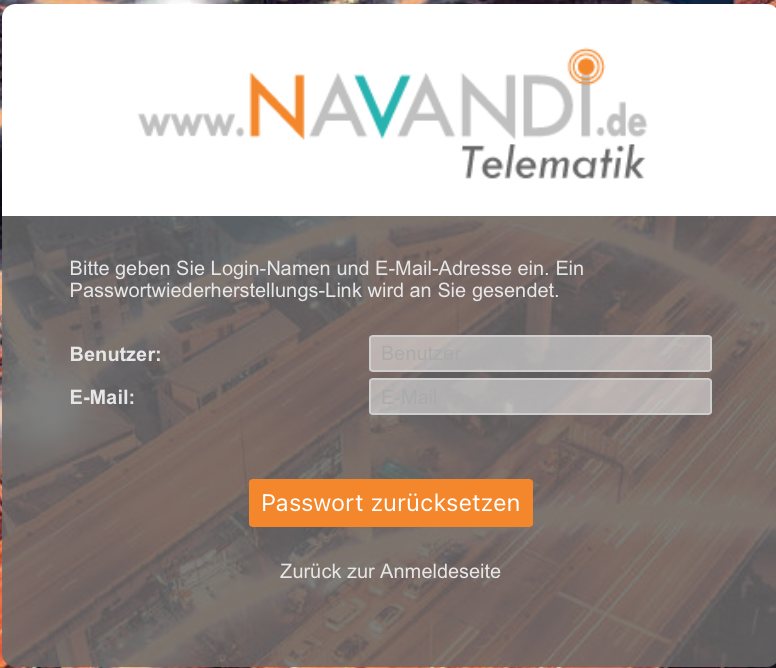 Wenn Sie NAVANDi Telematik mit einem PC verwenden, können Sie die Option Erinnern aktivieren, um die Anmeldedaten zu speichern. In diesem Fall brauchen Sie beim nächsten Besuch von NAVANDi Telematik nicht mehr Ihren Benutzernamen und Ihr Passwort eingeben. Diese Möglichkeit ist nützlich, wenn die Sitzung unterbrochen wurde. Sie werden automatisch wieder am System angemeldet, wenn Sie die NAVANDi Telematik in Ihrem Browser aufrufen. Die Option ist auf 30 Tage beschränkt. Sie wird ebenfalls deaktiviert, wenn Sie sich beim System abmelden.
