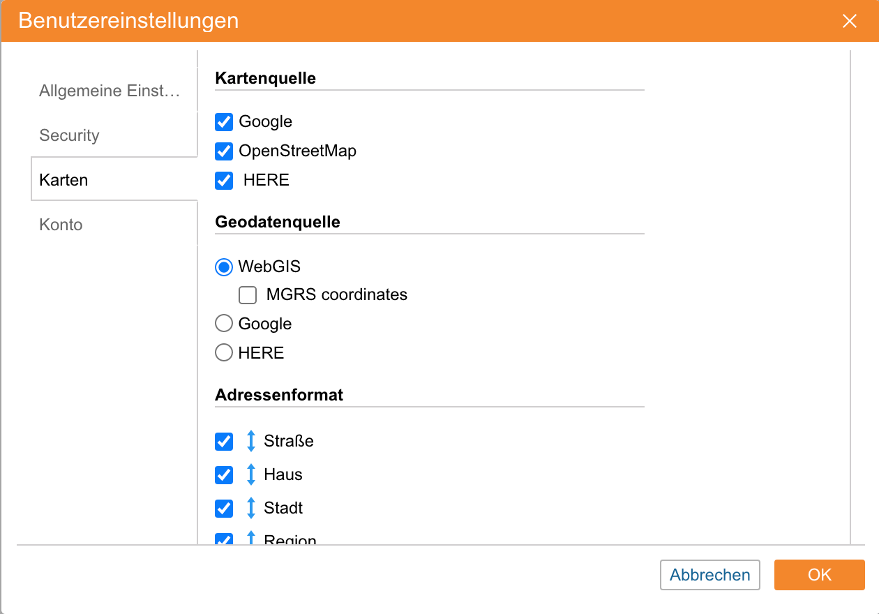 Karteneinstellungen werden auf der Registerkarte Karten in den Benutzereinstellungen angepasst.