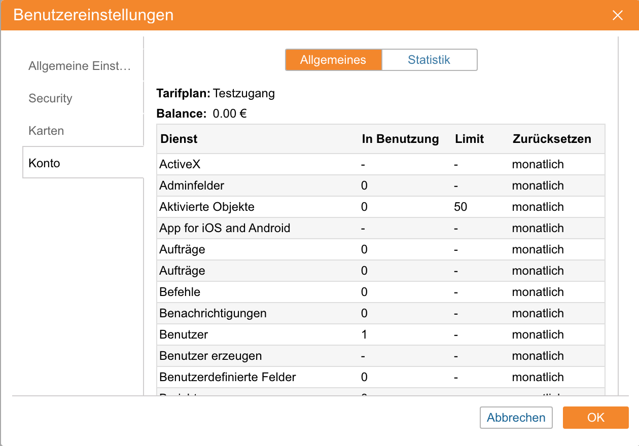 Im Abschnitt Allgemein werden der Name des Abrechnungsplans, der aktuelle Saldo und die Tabelle mit der Liste der verfügbaren Dienste angezeigt. Die Tabelle enthält vier Spalten.