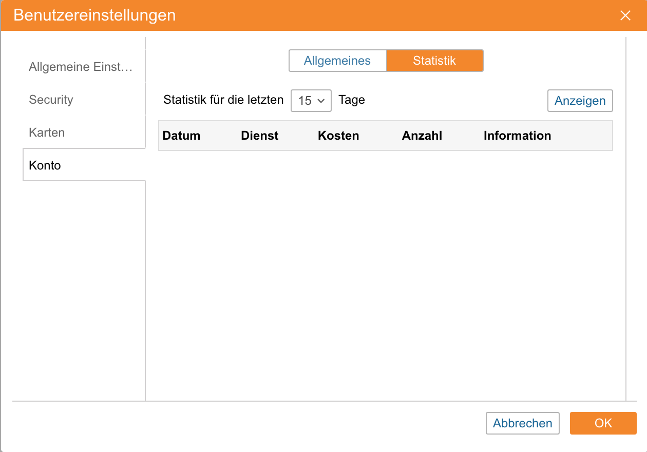 Im Abschnitt Statistik können Sie Informationen über Servicegebühren für den Zeitraum von bis zu 60 Tagen erhalten. Wählen Sie dazu das erforderliche Zeitintervall aus und drücken Sie auf Anzeigen.