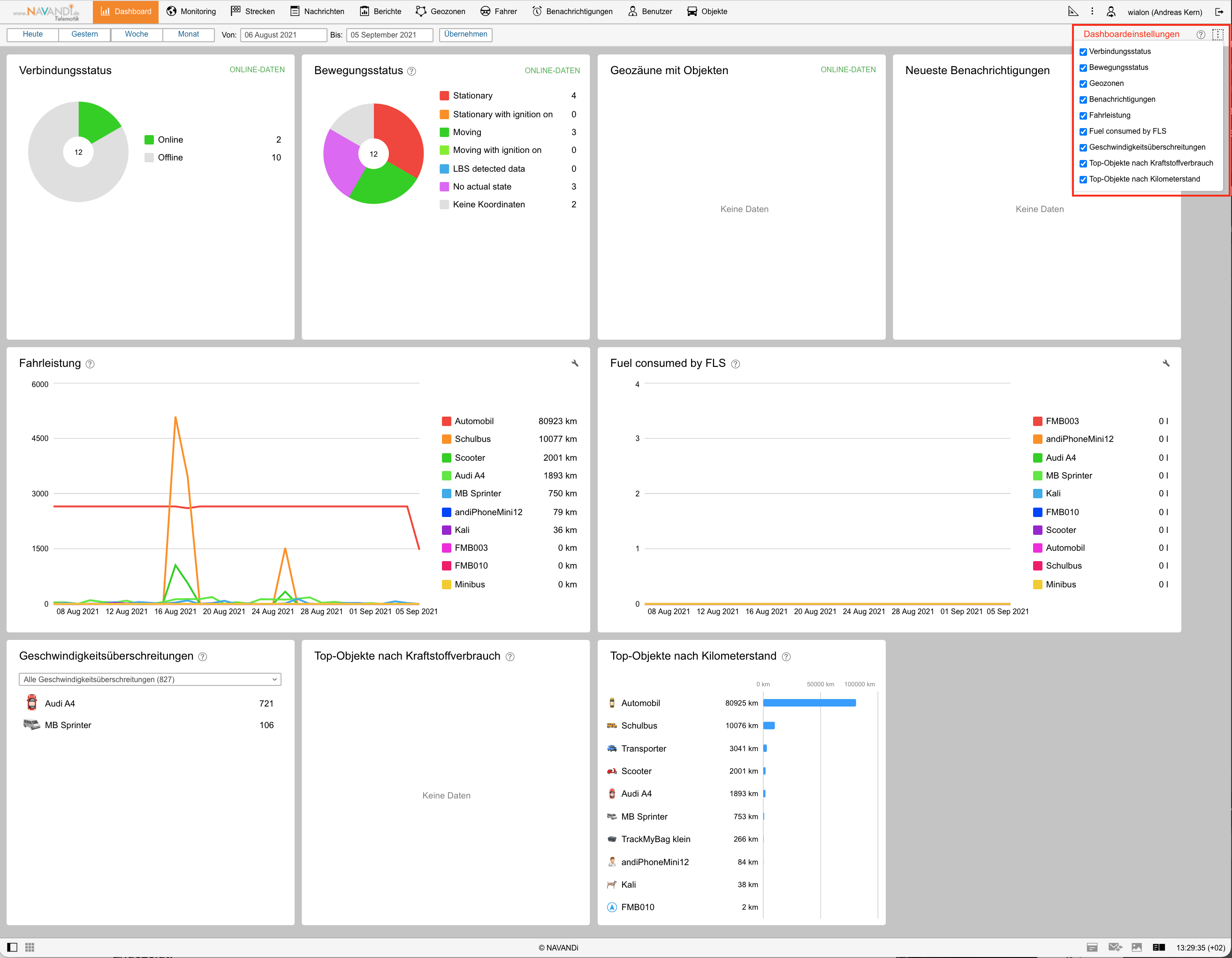 Der Verbindungsstatus, der Bewegungszustand, Geofences mit Einheiten, neueste Benachrichtigungen-Blöcke zeigen Echtzeitdaten an. Die Blöcke Kilometerstand, Kraftstoffverbrauch von FLS, Speedings zeigen standardmäßig Informationen der letzten sieben Tage an. Um Daten für einen anderen Zeitraum anzuzeigen, füllen Sie die Intervallfelder mit Anfang und Ende manuell oder über den Kalender aus und klicken Sie auf "Anzeigen". Um Daten für einen bestimmten Tag anzuzeigen, geben Sie sie als Beginn und Ende des Intervalls an. Außerdem können Sie eines der voreingestellten Intervalle auswählen: heute, gestern, Woche, Monat. Jedes Mal, wenn Sie sich anmelden, wird das Standardintervall angewendet.