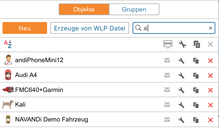 Wenn eine Liste viele Einträge enthält, kann es das schnelle Finden von bestimmten Einträgen erschweren. Zur Vereinfachung können Sie die dynamische Suche verwenden, die auf den meisten Registerkarten verfügbar ist. Beginnen Sie mit der Eingabe des Namens des Objekts (Geozone, Objekt, Route usw., abhängig von der aktiven Registerkarte). Sie brauchen nur einen Teil des Namens eingeben. Während Sie den Text eingeben, werden nur die Elemente angezeigt, die Ihrer Eingabe entsprechen. Bei der Suche wird nicht zwischen Groß- und Kleinschreibung unterschieden.