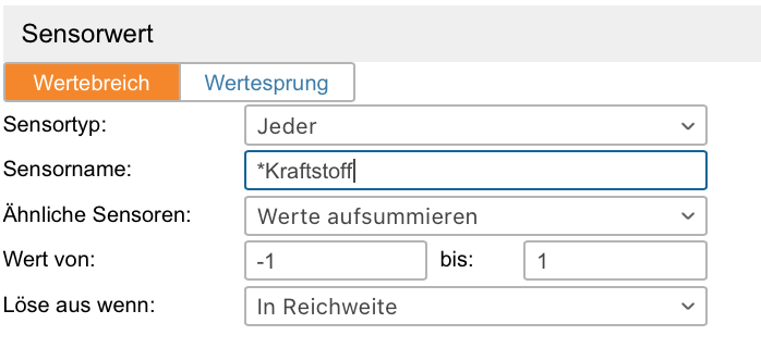 Angenommen, ein Gerät verfügt über zwei Kraftstoffsensoren mit den Namen Kraftstoffstandsensor und Kraftstoff im Tank und Sie möchten eine Benachrichtigung erstellen, die die Werte beider Sensoren berücksichtigt. Dazu sollten Sie die Namensmaske so festlegen, dass sie mit beiden Sensoren übereinstimmt. In diesem Fall wäre *Kraftstoff* die beste Wahl.