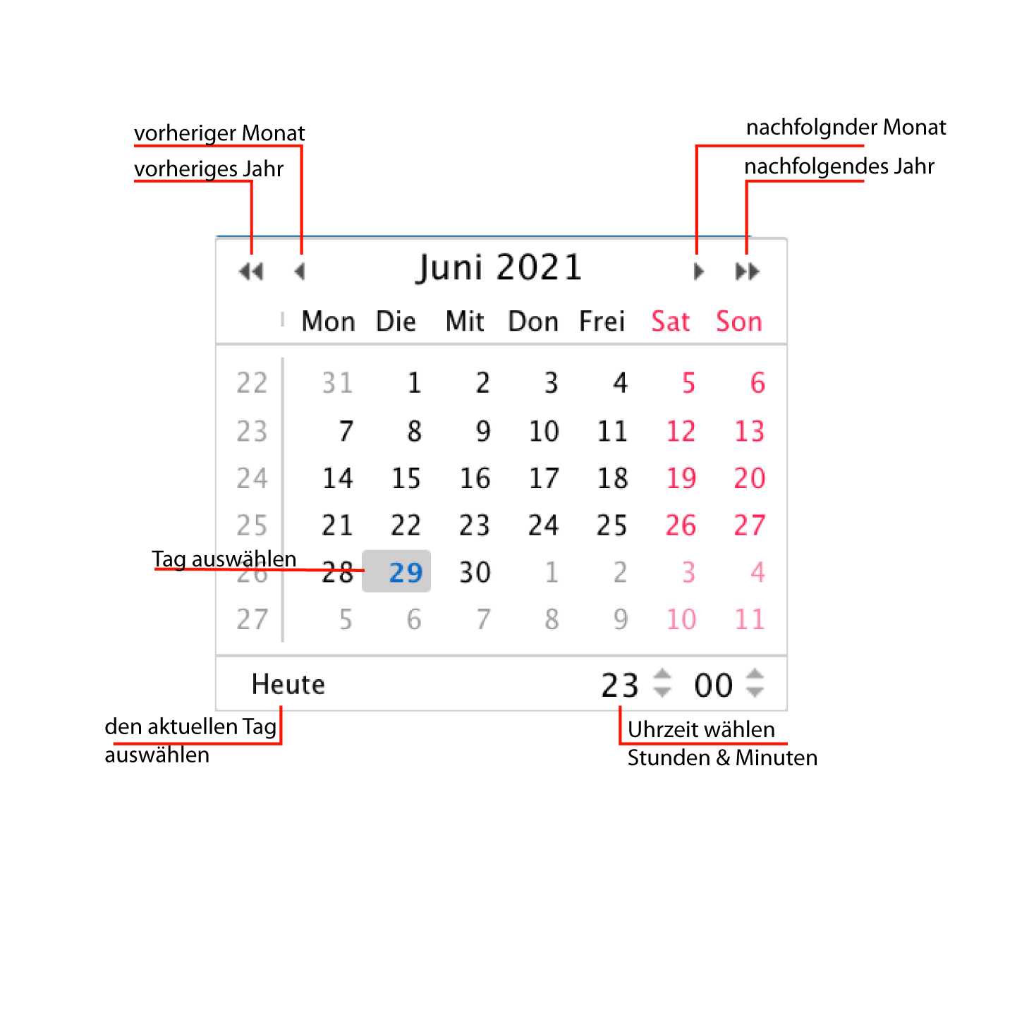 Es gibt mehrere Methoden mit dem Kalender zu arbeiten und schnell ein gewünschtes Datum und eine gewünschte Uhrzeit einzurichten: manuelle Eingabe, mit Schaltflächen oder dem Mausscroll usw.