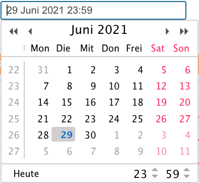 Für eine noch genauere Zeitangabe geben Sie vor der Auswahl des Datums die Uhrzeit in der unteren rechten Ecke des Kalenders an. Die Werte können Sie mit der Tastatur oder mit dem Mausrad eingeben. Änderungen werden übernommen, wenn Sie mit der linken Maustaste auf das Datum geklickt oder die Eingabetaste gedrückt haben.
