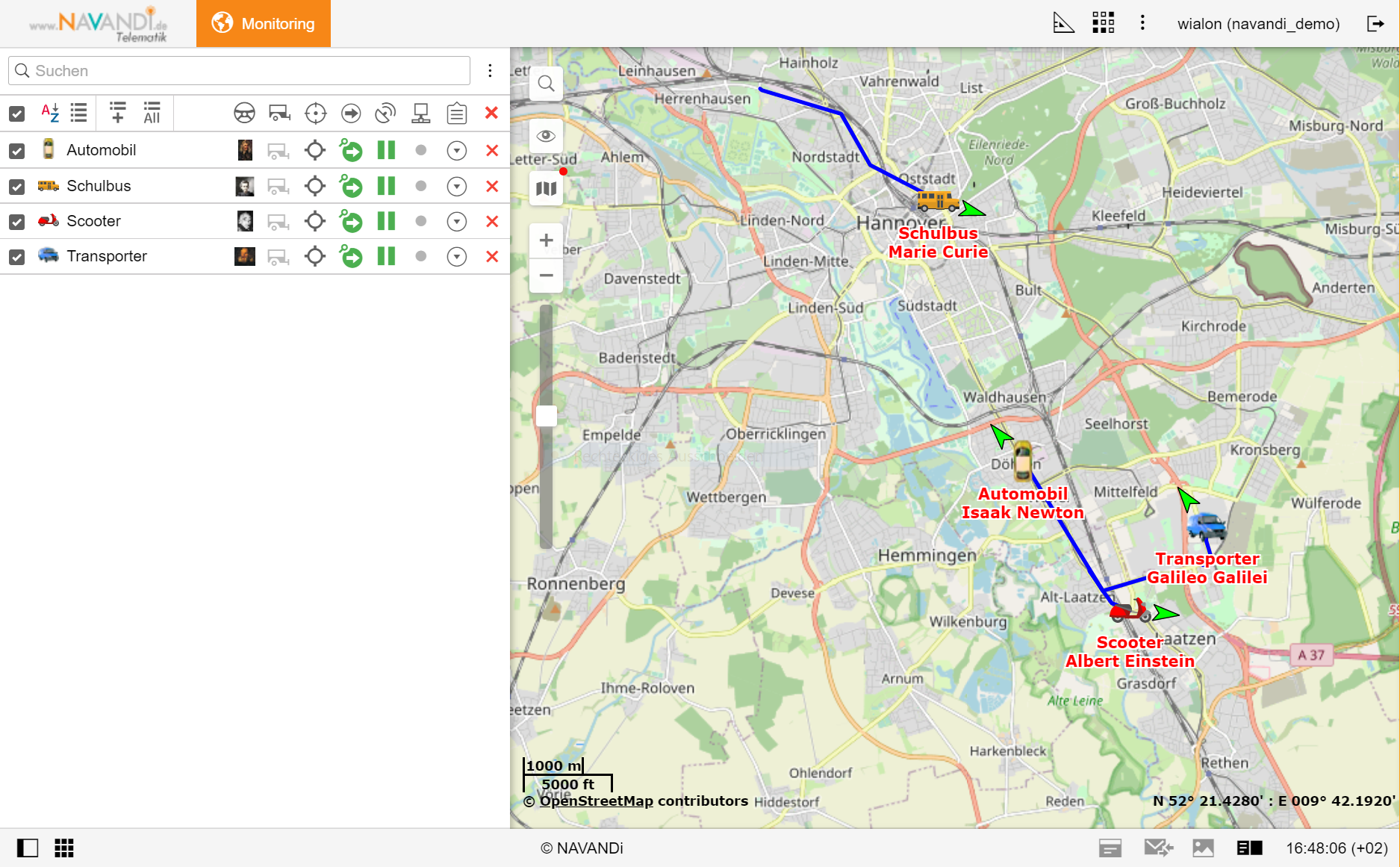 Die Registerkarte "Überwachung" bietet Zugriff auf die wichtigsten Tracking-Funktionen. Hier können Sie die Bewegung von Einheiten auf der Karte beobachten, Befehle und Nachrichten an sie senden, Fotos und Videos anfordern, Parameteränderungen online überwachen usw.